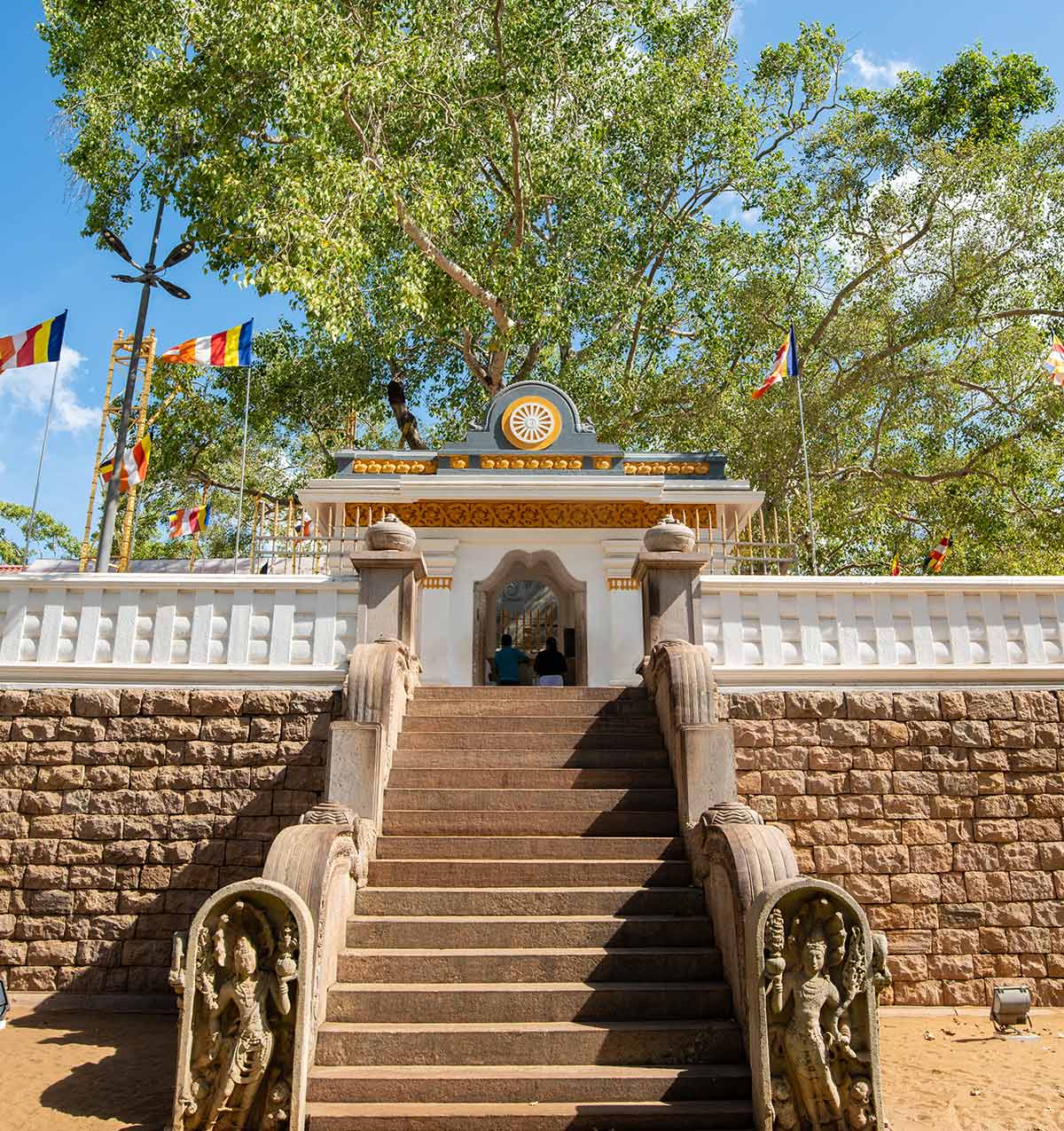 This sacred Bodhi tree, over two millennia old, stands as a symbol of peace and devotion, surrounded by tranquil temple gardens where pilgrims gather to worship.