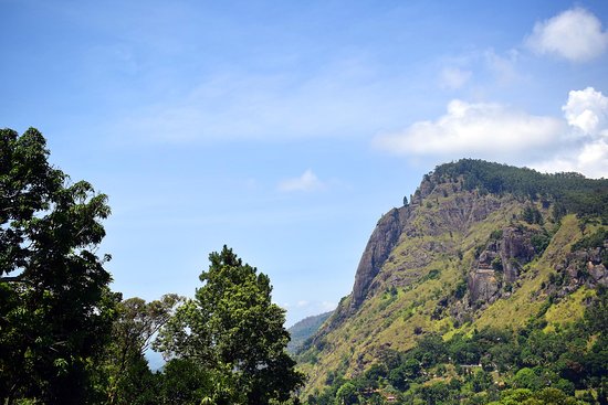 Diyaluma Falls, Sri Lankaβs second highest waterfall, surrounded by greenery.